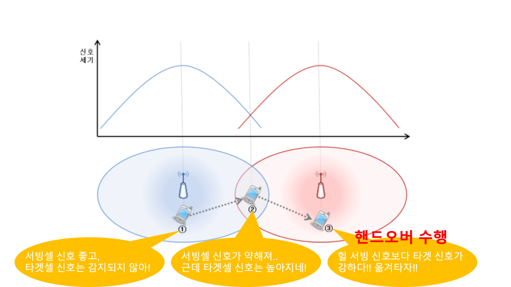 즉, 1번에서 3번으로 이동하면서 서빙신호보다 타겟신호가 강해지는 위치에 오면 핸드오버 절차 수행