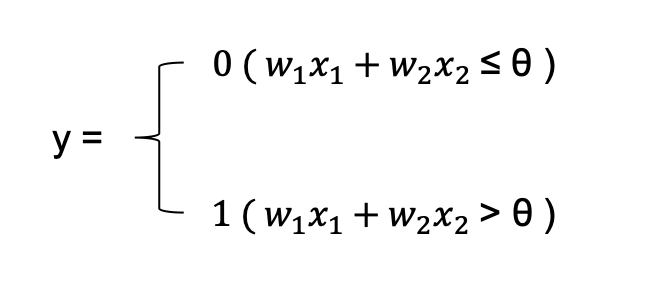 해당 퍼셉트론은 2개의 입력 신호 x1, x2에 대해 각각 w1, w2 라는 가중치를 곱한 후 그 값이 θ보다 커야 1이 된다.