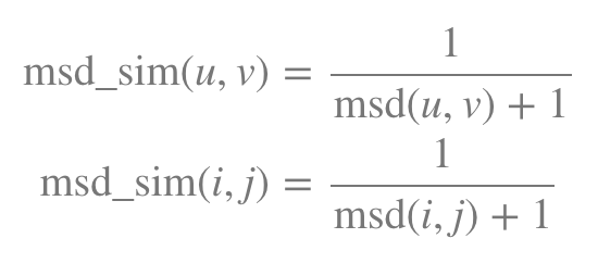 def sim_msd(data, name1, name2): diff = 0 count = 0 for title in data[name1]: if title in data[name2]: # print('commonly watched movie ->', title) diff += pow(data[name1][title] - data[name2][title], 2) count += 1 sim_msd = 1/( 1 + (diff/count) ) print('** msd similariy = ', sim_msd) return sim_msdratings = { 'doky':{'Anne_with_an_E':5,'Strange_Things':3,'The_Escape':3}, 'steve':{'Anne_with_an_E':5,'Strange_Things':1,'The_Escape':4}, 'jamie':{'Anne_with_an_E':0,'Strange_Things':4,'The_Escape':5}, 'bobby':{'Anne_with_an_E':2,'Strange_Things':1,'The_Escape':5}, 'cookie':{'Anne_with_an_E':2,'Strange_Things':1} }sim_msd(ratings, 'doky', 'cookie')
