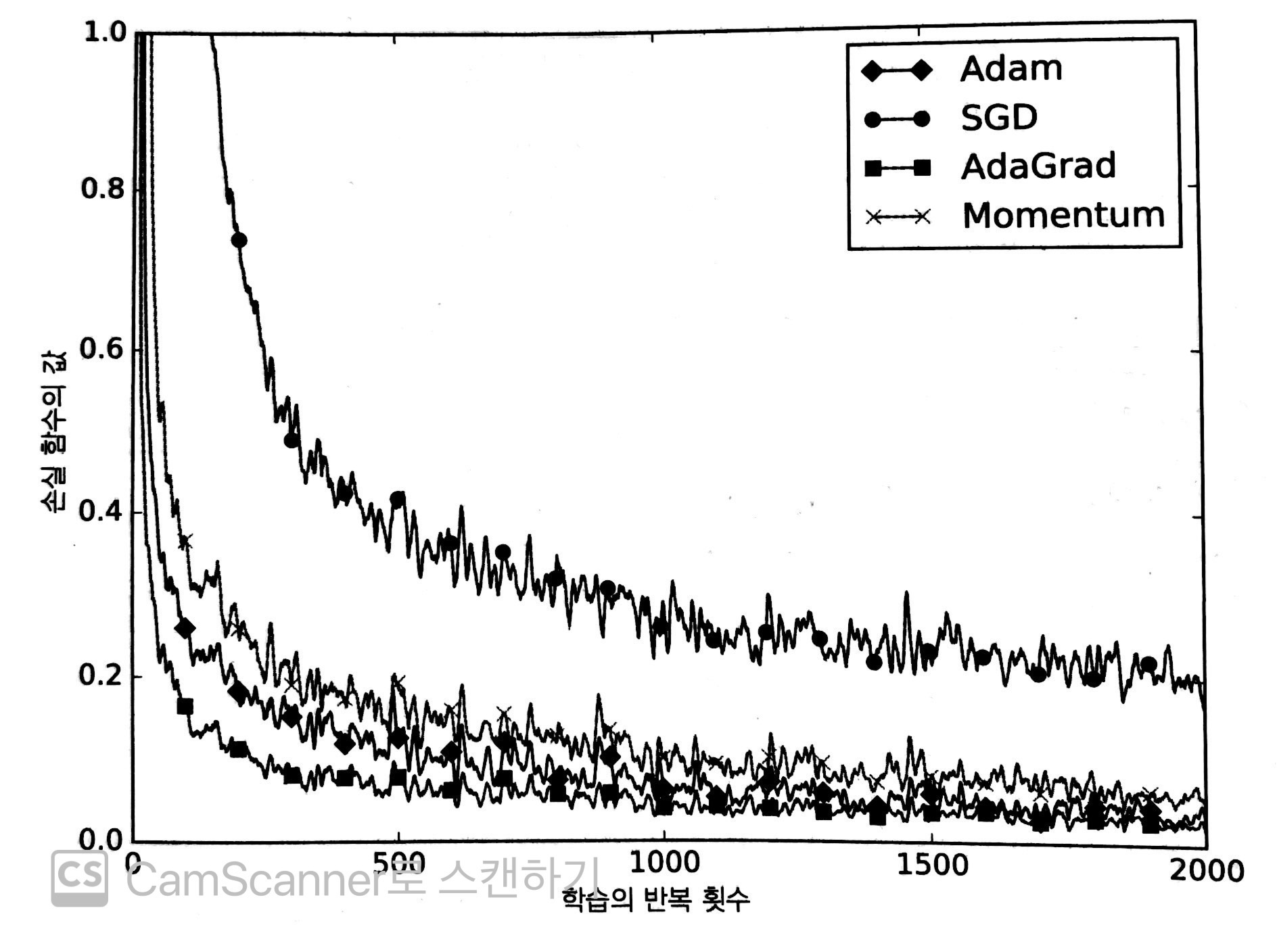 [그림 11]의 결과를 보면 SGD의 학습 진도가 가장 느리다.