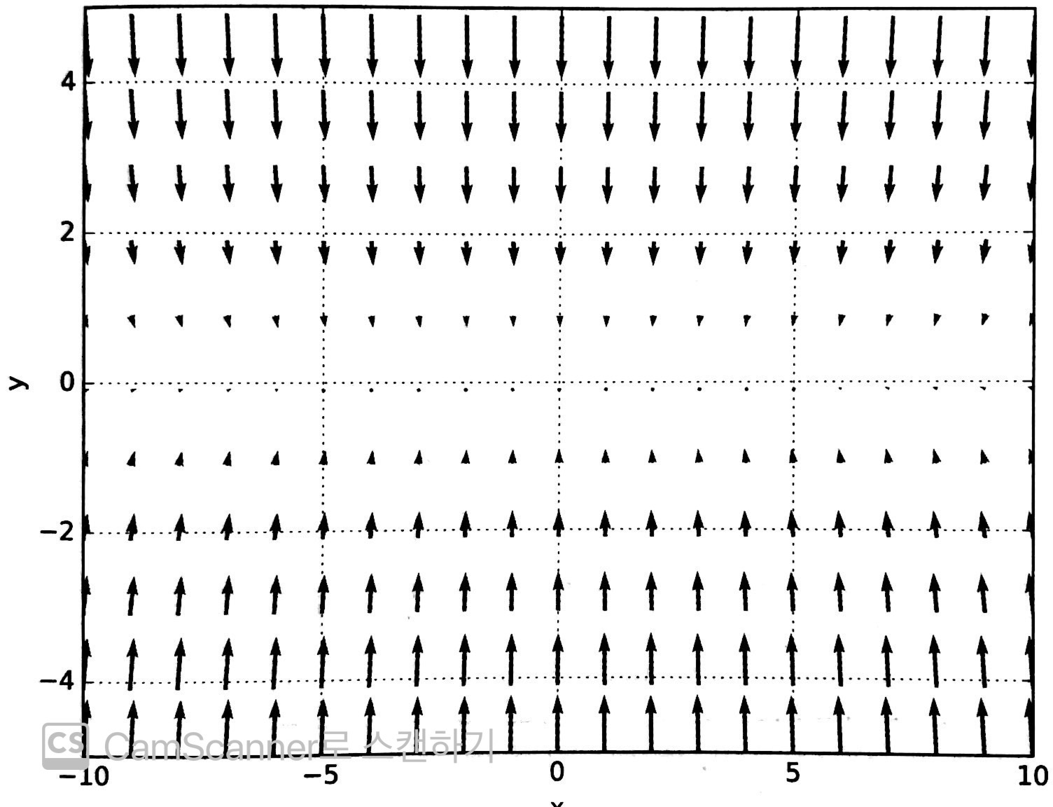 또 주의할 점으로는 [그림 2]가 최솟값이 되는 장소는 (x, y) = (0, 0)이지만 [그림 3]이 보여주는 기울기 대부분은 (0, 0) 방향을 가리키지 않는다는 것이다.