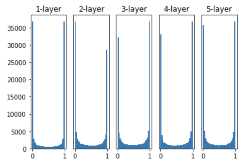 각 층의 활성화값들이 0과 1에 치우쳐 분포되어 있다.