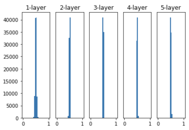 이번에는 표준편차가 1인 정규분포를 이용했는데, 표준편차를 바꿔가며 활성화값들의 분포가 어떻게 변화하는지 관찰하는 것이 이 실험의 목적이다.