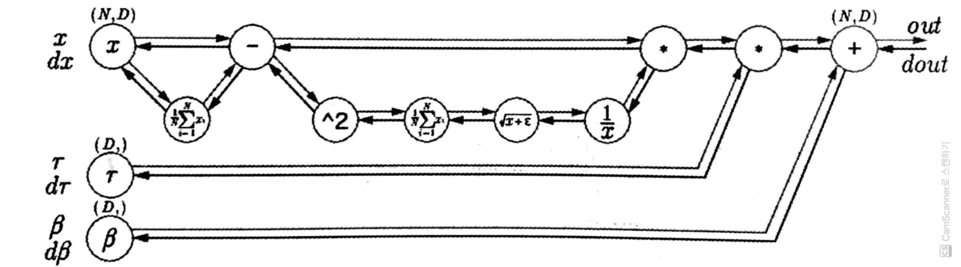 배치 정규화 알고리즘은 신경망에서 순전파 때 적용되고, 이를 계산 그래프로 [그림 4]와 같이 그릴 수 있다.