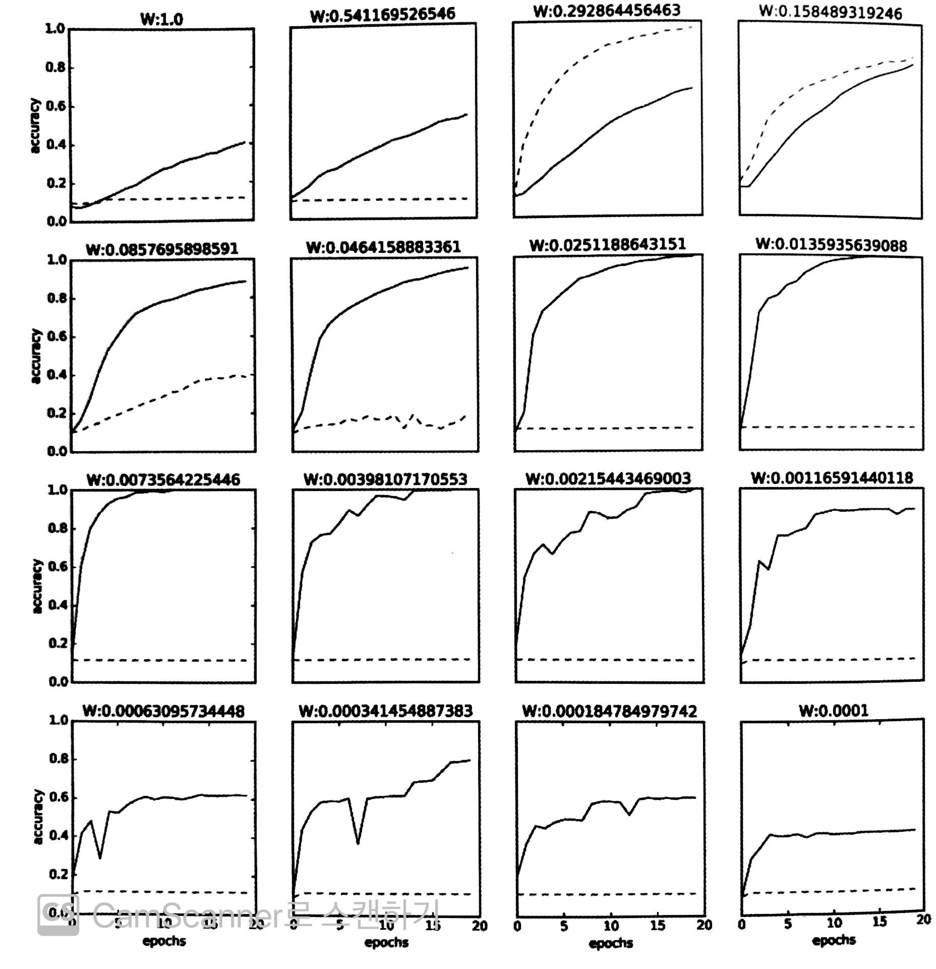 [그림 6]은 가중치 초깃값의 표준편차를 다양하게 바꿔가며 학습 경과를 관찰한 그래프이다.