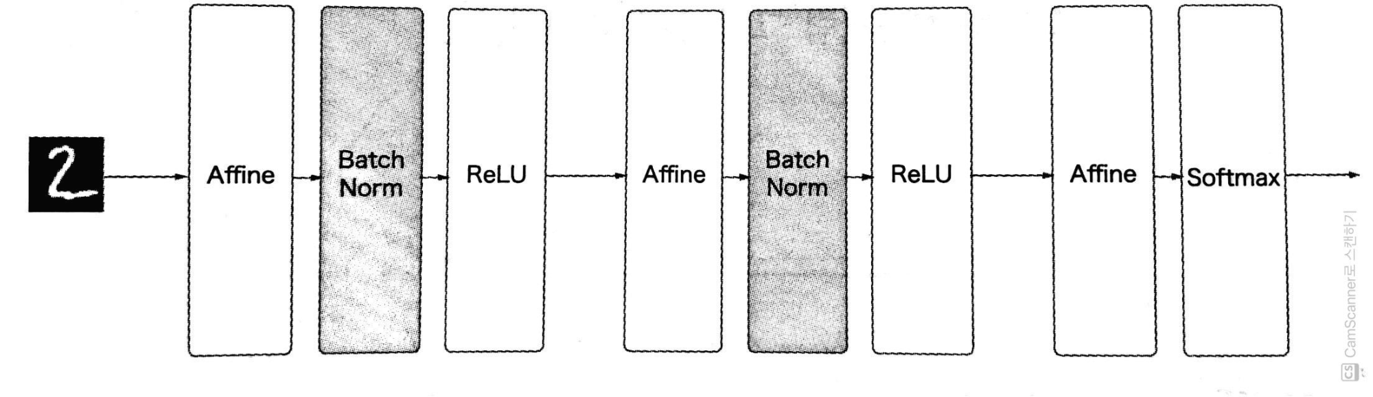 그래서 [그림 1]과 같이 데이터 분포를 정규화하는 '배치 정규화(Batch Norm) 계층'을 신경망에 삽입한다.