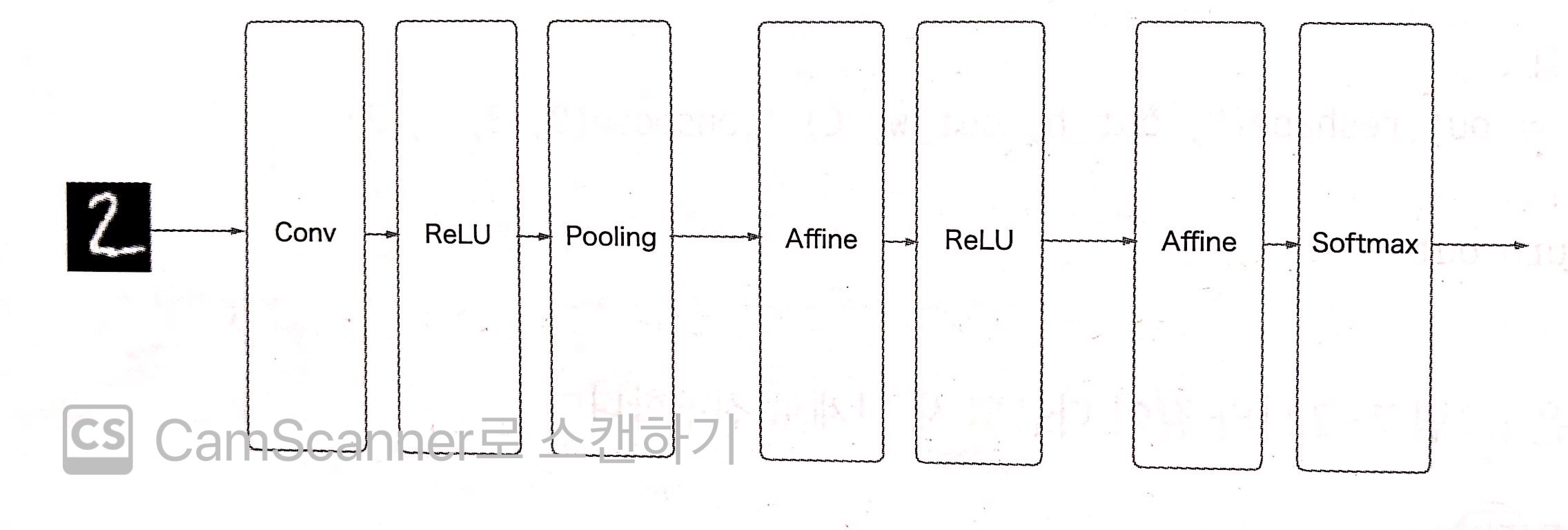 그림 7 [그림 7]의 CNN 네트워크는 "Convolution-ReLU-Pooling-Affine-ReLU-Affine-Softmax" 순으로 흐른다.